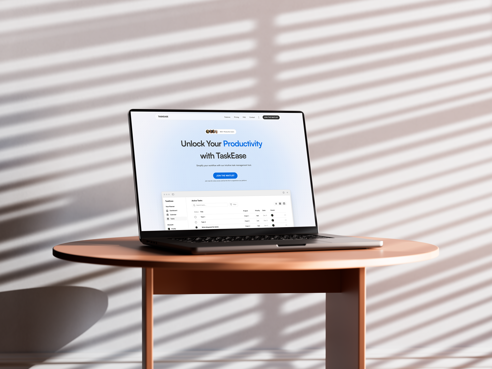 A waitlist call to action is also included, designed to collect early user interest during the product launch phase.